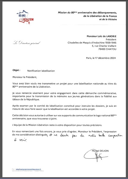 La Mission « 80 ans Libération » a annoncé officiellement le mois dernier la labellisation de notre projet mémoriel par le comité national”.